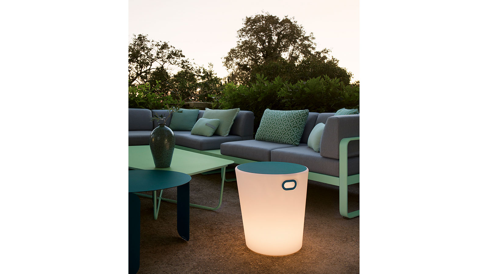 Steuerung über Schalter oder auf Entfernung über integriertes, mit der Anwendung „Fermob lighting“ kompatibles Bluetoothsystem,