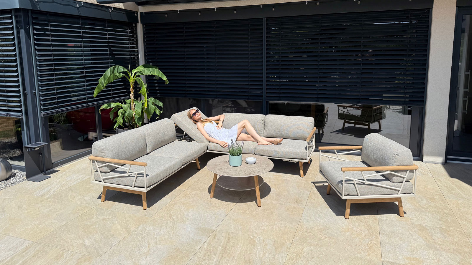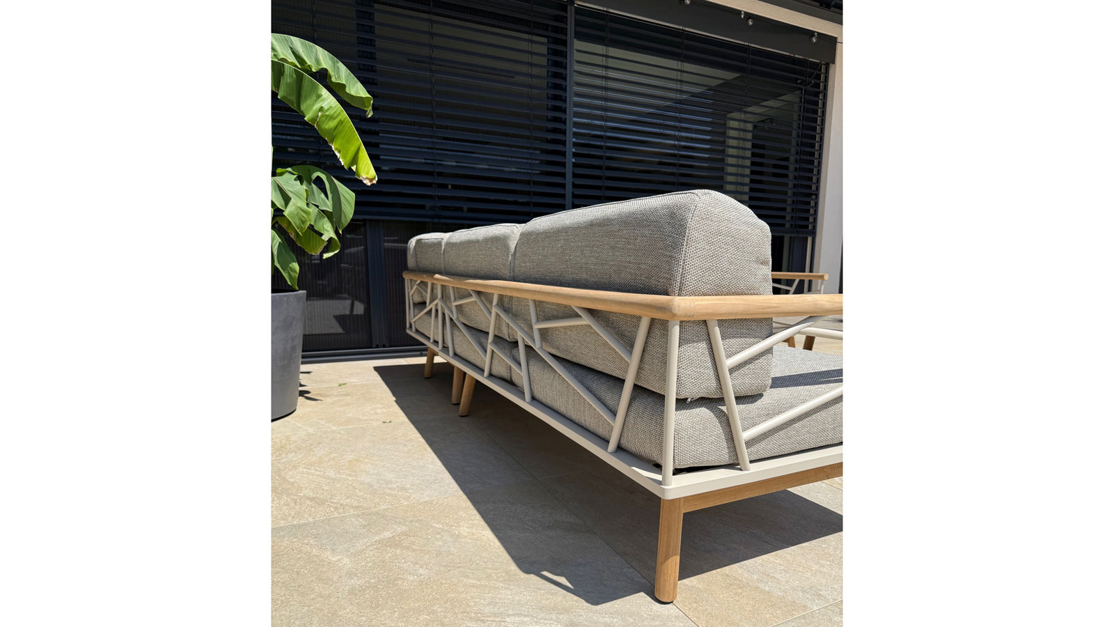 - Beine und Armlehnen: Teakholz