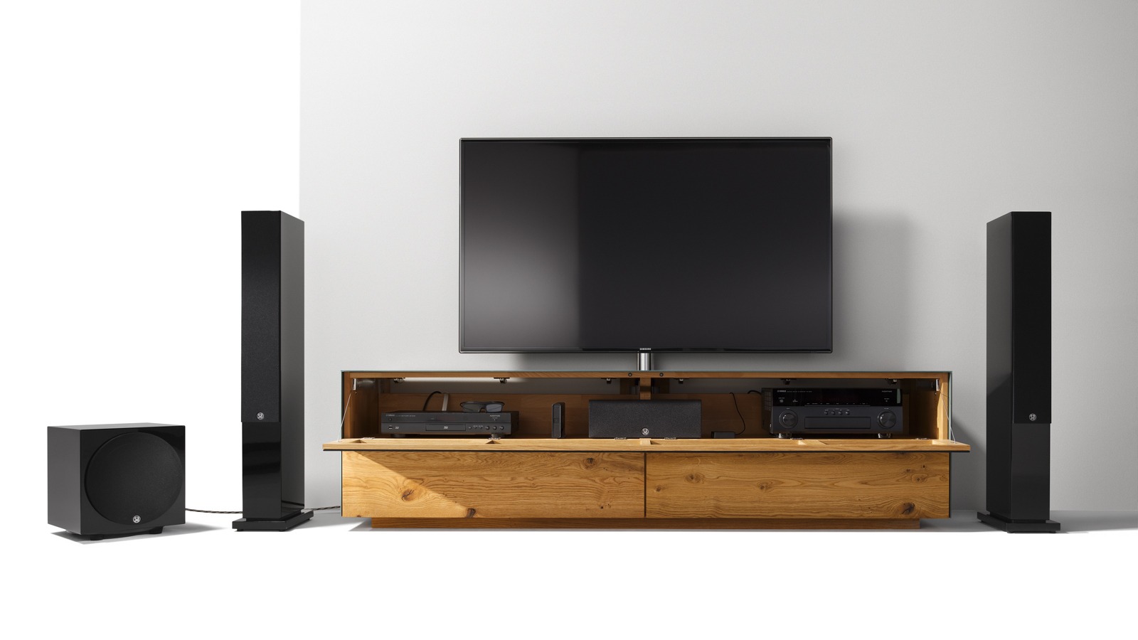 - Front: Eiche wild massiv geölt / Akustikstoff schwarz